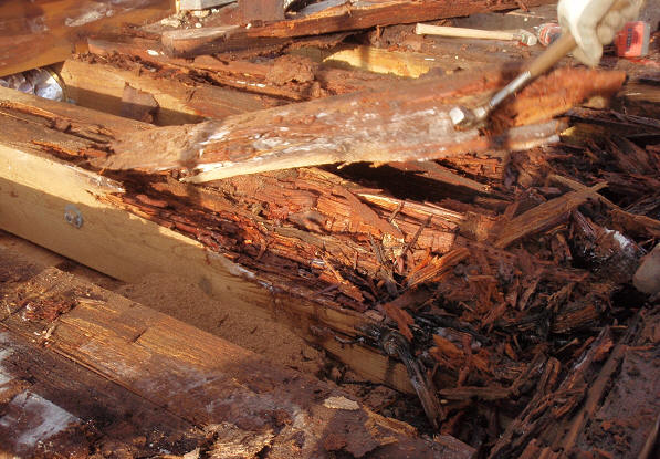 Zur Sanierung gehört neben der Belagssanierung und den dazugehörenden Rinnen und Verwahrungen evtl. auch die Erneuerung des Unterbaus. Bei Betonbalkonen gibt es hierfür spezielle Verfahren und Materialien, um freiliegende Armierungseisen zu entrosten und für die Zukunft dagegen zu schützen sowie abgebröckelten Beton wieder zu ergänzen. Bei Balkonen, Loggien oder Terrassen mit einem Holzunterbau, kann dieser je nach Qualität der bislang vorliegenden Abdichtungen und Verwahrungen stark angegriffen sein und somit teilweise das Betreten sogar gefährlich werden. Hier sollte in gewissen Zeitabständen eine Wartung erfolgen oder eine von Grund auf solide Abdichtung (einschl. passenden Verwahrungen) aufgebracht werden, so dass kein Wasser eindringen kann. Selbstverständlich führen wir diese Arbeiten auch aus. Im Folgenden sehen Sie ein solches Beispiel, bei welchem (fast) zu lange gewartet wurde: