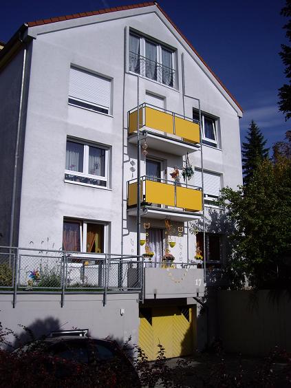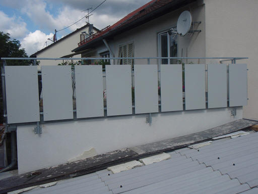 Oft in Verbindung mit der Balkonsanierung, aber auch getrennt ausführbar, steht die Erneuerung des Balkongeländers in verschiedenen Metallausführungen (verzinkt oder Edelstahl) und/oder mit speziellen Verkleidungen. Neben Geländerfüllungen aus Metall oder Glas erfreut sich eine Balkongeländerbekleidung mit Trespa Meteon (dekorative, massive Platten, Oberfläche aus pigmentierten Harzen, ausgehärtet durch ein weltweit patentiertes Verfahren, das hervorragende Eigenschaften aufweist und insbesondere eine extreme Witterungsbeständigkeit gewährleistet) immer größerer Nachfrage. Neben einem umfangreichen Farb-, Oberflächen- und Dekorsortiment gibt es diese in verschiedenen Stärken und nach Maß zugesägt. Muster, Beispiele sowie eine Übersicht über das komplette Sortiment können Sie gerne vor Ort einsehen. Im Folgenden einige Beispiel von uns angebrachter Trespa-Verkleidung: